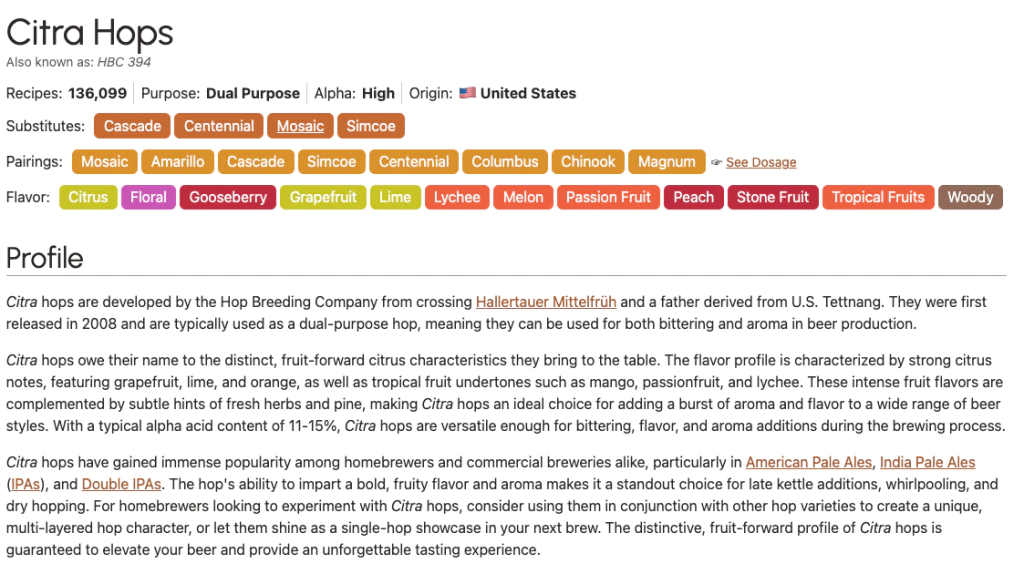 O lúpulo Citra foi lançado para cultivo em 2008 e tornou-se a variedade de aroma mais popular dos EUA com características de sabor cativantes, perfeitamente adequada para estilos de cerveja modernos tais como Pale Ale, IPA ou New England IPA. Graças aos aromas tropicais de limão, lima ou manga, o Citra pode ser combinada como um único lúpulo, bem como com muitas outras variedades de aromas como o Sultana, BRU-1, Lotus, Ekuanot ou Vic Secret. Graças ao elevado ácido alfa, o Citra também pode ser utilizada para amargar; no entanto, o lúpulo desenvolve todo o seu aroma com fervura tardia, na banca de lúpulo ou com entupimento a frio.