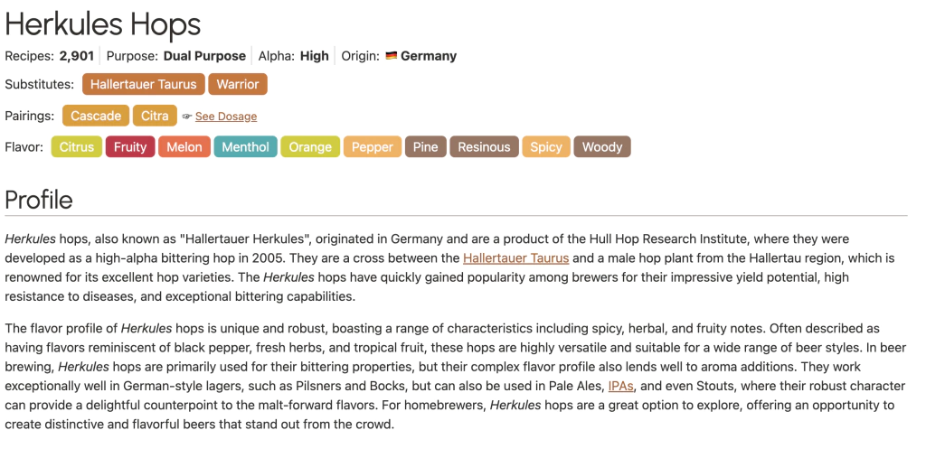 A variedade de lúpulo Herkules, originária da Alemanha, é um dos mais populares lúpulos amargos continentais. A variedade alfa alta impressiona pela sua amargura neutra e pode por isso ser usada em muitos estilos clássicos de cerveja como Pils, Märzen, Münchner Helles, Bockbier, Rotbier ou Zwickl. Herkules alcança os melhores resultados quando utilizado como lúpulo para malte ou para lúpulo amargo.