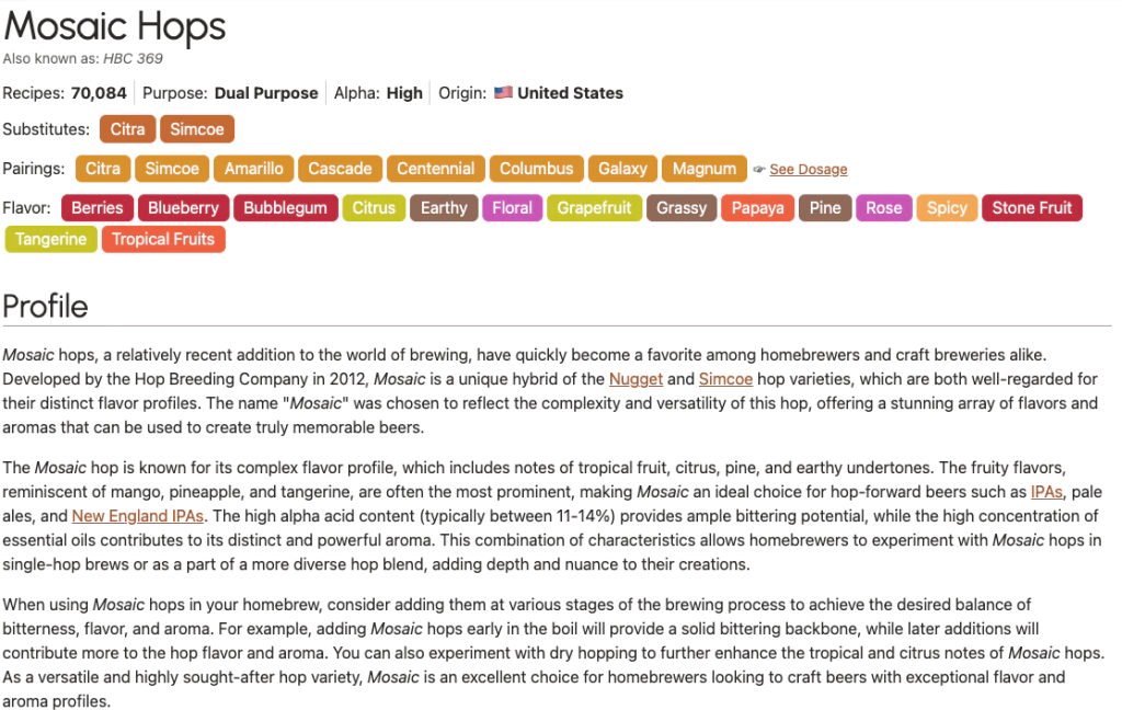 Lúpulo Mosaic é conhecido por seu perfil de uso triplo, que inclui amargor, sabor e aroma. Possui altos alfa ácidos, mas baixo cohumulone, o que o torna agradavelmente lupulado, trazendo sabores de manga, pinho, frutas cítricas, ervas e aromas de frutas tropicais. É o primeiro filho de Simcoe e Nugget.