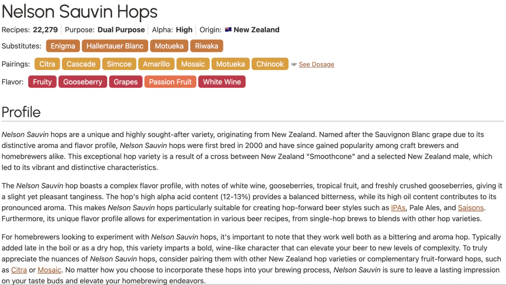 O Lúpulo Nelson Sauvin foi desenvolvido pelo New Zealand Institute for Plant and Food Research para o programa de criação de lúpulo, e lançado em 2000 de um mix de lúpulos da Nova Zelândia. É conhecido por ser uma das variedades de lúpulo mais originais, exibindo características frutadas fortes e aroma de vinho branco. Aromas específicos incluem distintivo "New World" caracteres de vinho branco, frutado lembrando groselha esmagada e sabores de infusão de uva.